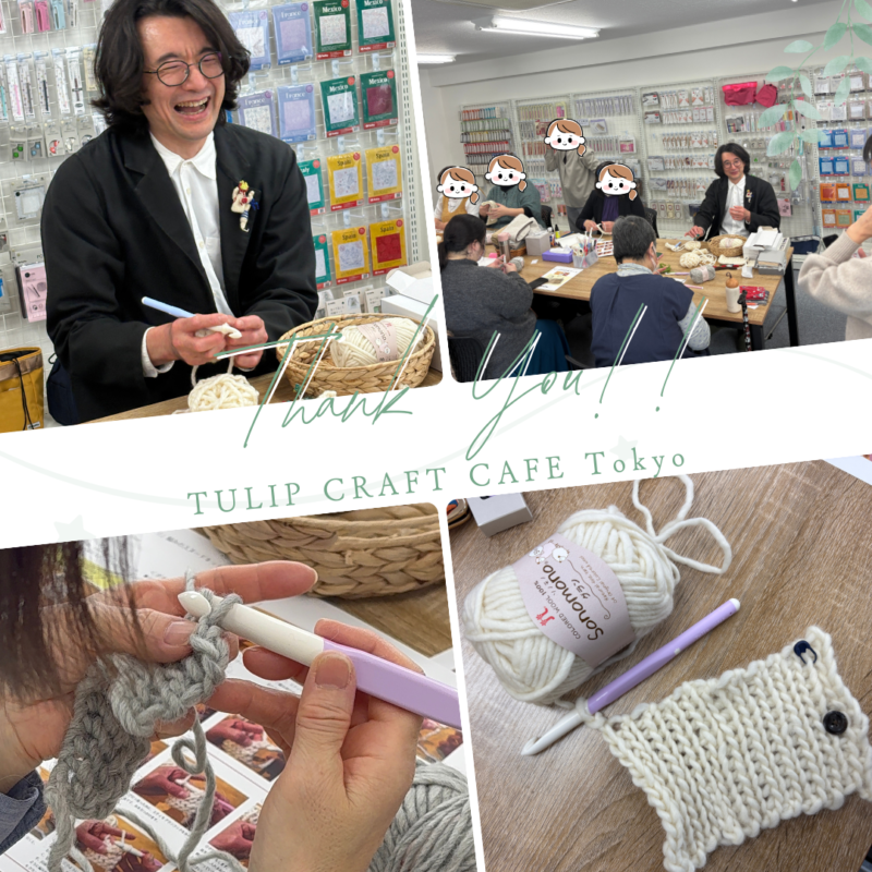 手芸トピックス 2026.02.25 お知らせ 2月のワークショップにご参加いただきありがとうございました 2026年2月20日(金)TULIP CRAFT CAFE Tokyoにて、ワークショップを開催しました。 2月のワークショップは、編みキノコ作家 横山 起也先生提案の「カギメリ」編みのスヌード。 「エティモ グランフック」を使い、棒針のメリヤスのような編地を作りました! ご参加いただいた皆様、本当にありがとうございました。 3月のワークショップ内容は、決まり次第チューリップクラフトカフェ メールマガジンやSNSにてお知らせいたします。楽しみにお待ちください。 次頁